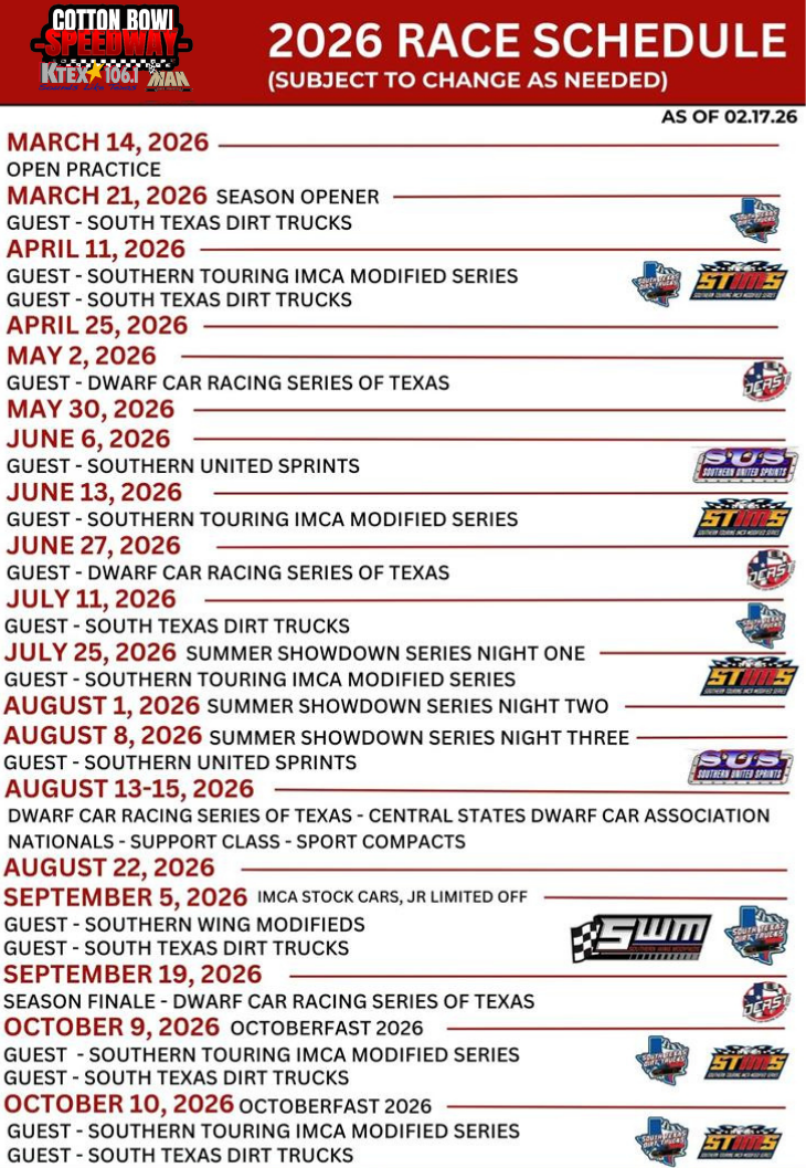 We’re looking forward to the 2026 season, and we’re bringing the energy all year long from the KTEX Country Balcony — the best seat in the house for high-speed action, cold drinks, and unforgettable Saturday nights in Paige!