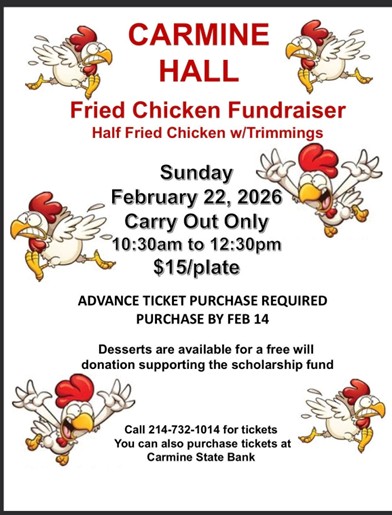 ADVANCE TICKET PURSHASE REQUIREDÂ PURCHASE BY FEBRUARY 14th ... call 214 732-1014 for tickets or purchase tickets at Carmine State Bank