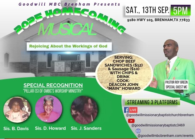 Allwise MBC will be celebrating the 7th Pastoral Appreciation Celebration for their Pastor Garry W. Jones on Sunday, September 7th 11:15 AM, the speaker will be Pastor Charles Allen of the Mt. Nebo MBC in Houston 2:30 PM the speaker is Pastor John Batiste, V with Ebenezer MBC in Chappell Hill |