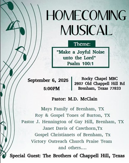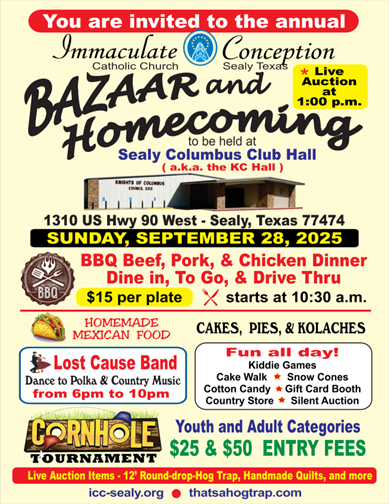 The Kulhanek Family Reunion will be held on Sunday, September 28th, beginning with a 10:00 a.m. mass at St. John the Baptist Catholic Church in Fayetteville, following Mass, gather at Heh, Remember When (3031 FM-1291, Ste 200, Fayetteville) for lunch and fellowship. Guests are invited to bring a favorite dish to share for the potluck luncheon […] Homecoming Service will be held at Mt. Zion Missionary Baptist Church in the Randle Hill Community; Sunday, September 28, starting at 2:30 PM, the guest speaker will be Rev. Ernest Heard, Jr., of the Macedonia Baptist Church in Plantersville. Rev. Calvin Kossie, host Pastor. |