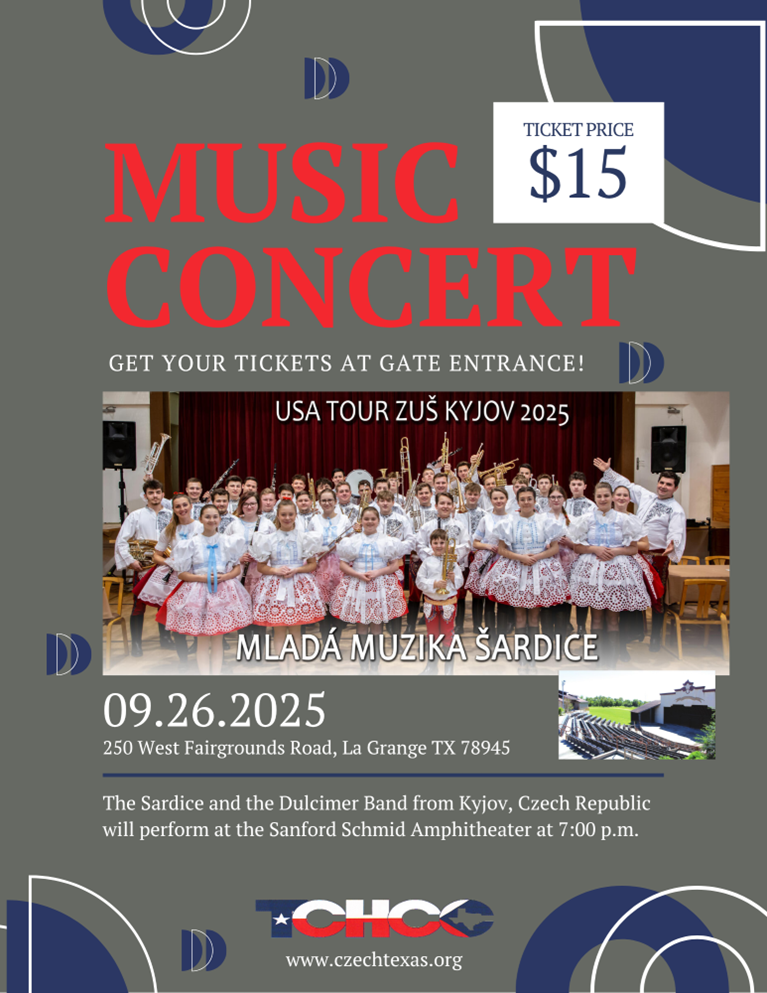 The Texas Czech Heritage and Cultural Center present a special evening of traditional Czech music with the Mladá Muzika Šardice and the Dulcimer Band from Kyjov, Czech Republic performing in La Grange at the Texas Czech Heritage & Cultural Center’s Sanford Schmid Amphitheater on Friday September 26th at 7P. Gates open at 5:30P. Concessions will […] |