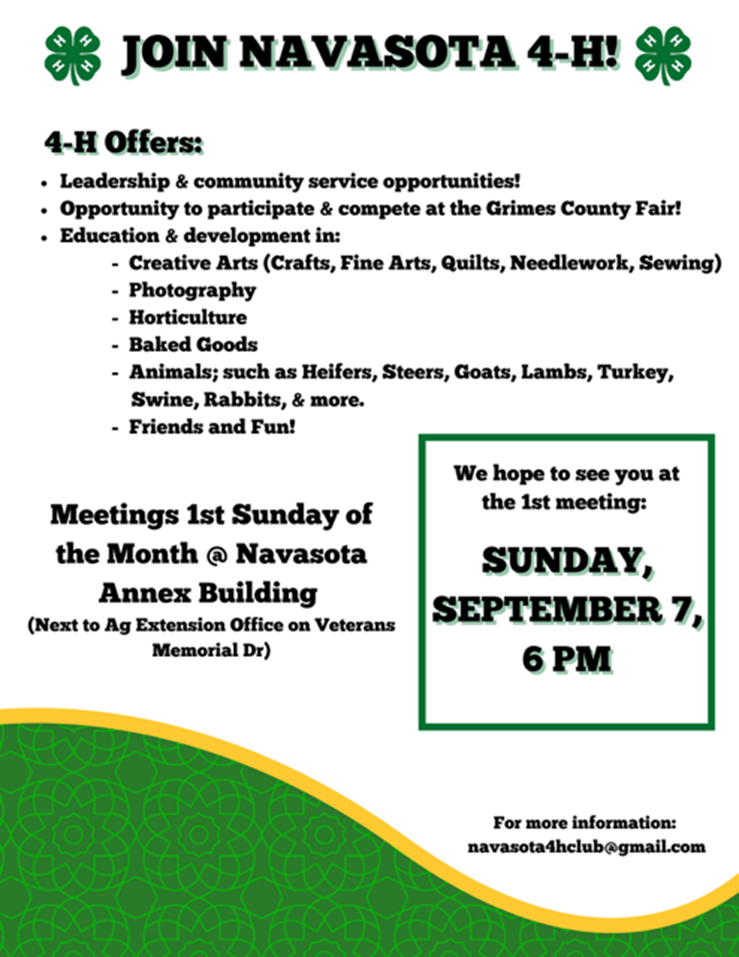VFW Post 7104, will be having a barbecued beef sirloin steak and pork sausage supper on Friday, October 3, doors will open at 6:00 and the meal will be served at 7:00. Call 979-203-5586 to make reservations by 12:00 noon on the date of the meal or you may call Post 7104 at 979-830-8776 and […]