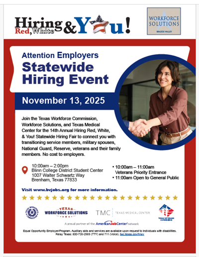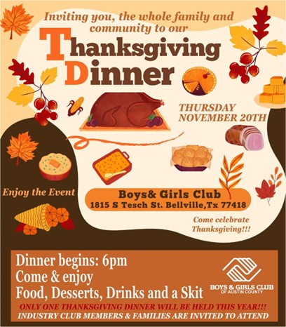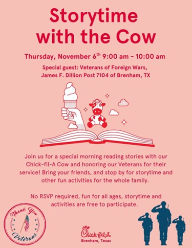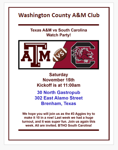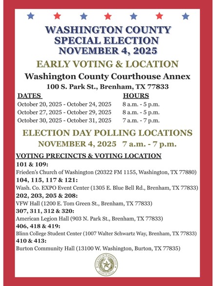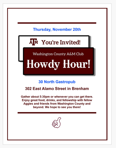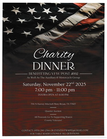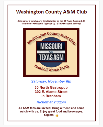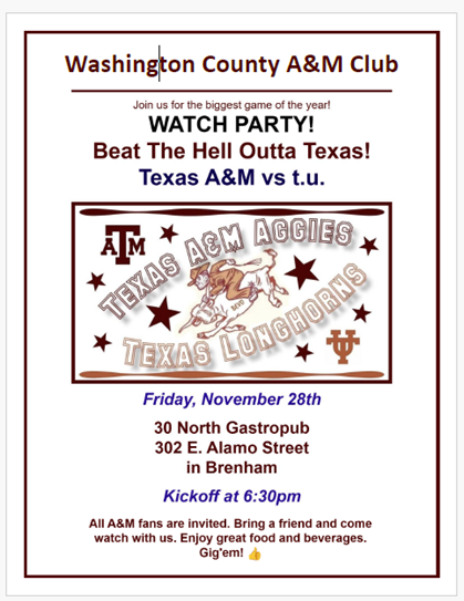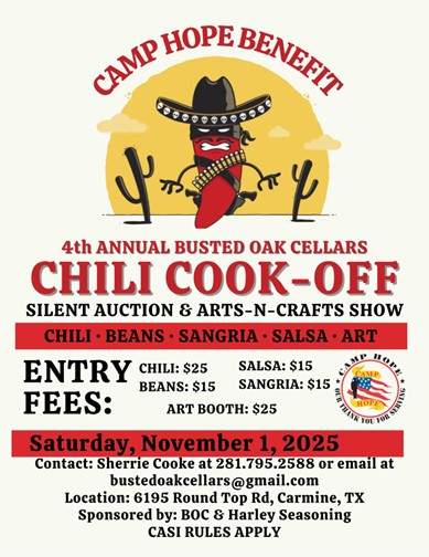 Come Celebrate Veterans Day on Tuesday, November 11, at the Cannery Kitchen. Social time at 5:30pm, Beef Chili & Chicken Stew served at 6pm. The speaker will be Christopher Hatley, Lieutenant Colonel, U.S. Army (retired) at 6:30pm. Host – Washington County Republican Club To RSVP for the meal text 979-451-9579 ($15 for members/$20 for non-members) |