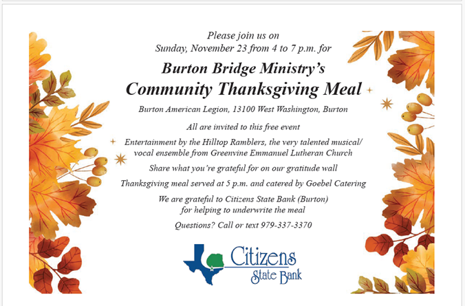 Hermann Sons Life-Brenham meeting will be held Friday, November 14, doors open at 5:00, meal served at 6:30 and the meeting will start around 7:15 at the Hermann Sons Life Hall-Brenham. This month serving fajitas with all the trimmings… members are asked to bring a dessert.