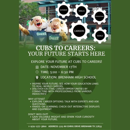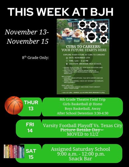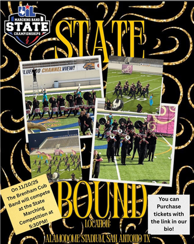 THE BRENHAM CUB BAND WILL COMPETE AT THE STATE MARCHING COMPETITION AT 5:30 PM |