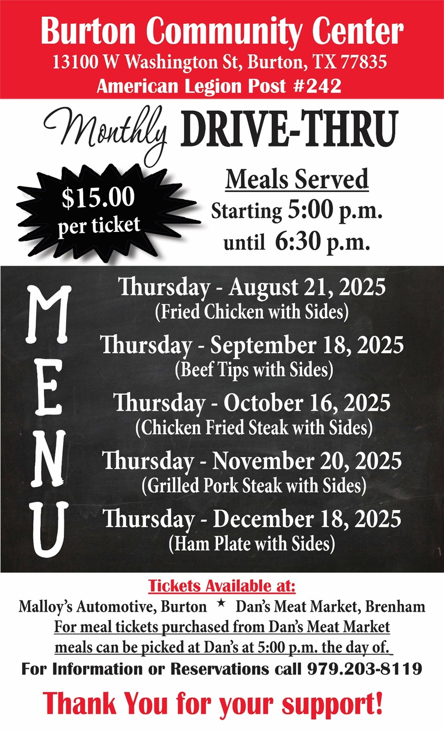 Hermann Sons Life-Brenham meeting will be held Friday, November 14, doors open at 5:00, meal served at 6:30 and the meeting will start around 7:15 at the Hermann Sons Life Hall-Brenham. This month serving fajitas with all the trimmings… members are asked to bring a dessert.