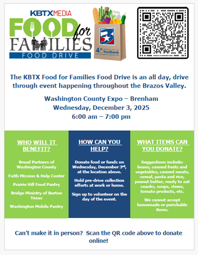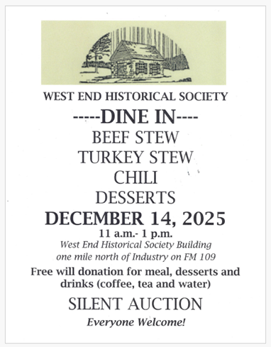 Come Celebrate Veterans Day on Tuesday, November 11, at the Cannery Kitchen. Social time at 5:30pm, Beef Chili & Chicken Stew served at 6pm. The speaker will be Christopher Hatley, Lieutenant Colonel, U.S. Army (retired) at 6:30pm. Host – Washington County Republican Club To RSVP for the meal text 979-451-9579 ($15 for members/$20 for non-members) |