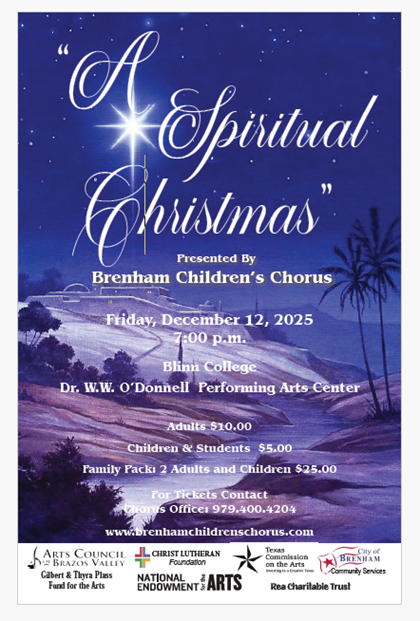 The Brenham Chorale, is beginning rehearsals for its 51st year of concerts, on September 29. The rehearsals are held on Monday nights, 5:30-7:00 PM at St. Peter’s Episcopal Church, in Brenham. Messiah will be held on Monday, December 8, at the church with reception following. The Director is Dr. Joanne Clark. A Spring concert that includes the […] |