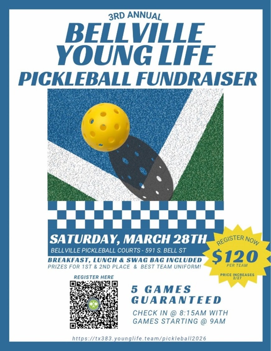 Bellville Young Life Pickleball Fundraiser March 28 Bellville Pickleball Courts 591 S. Bell Street, Bellville, TX, United States