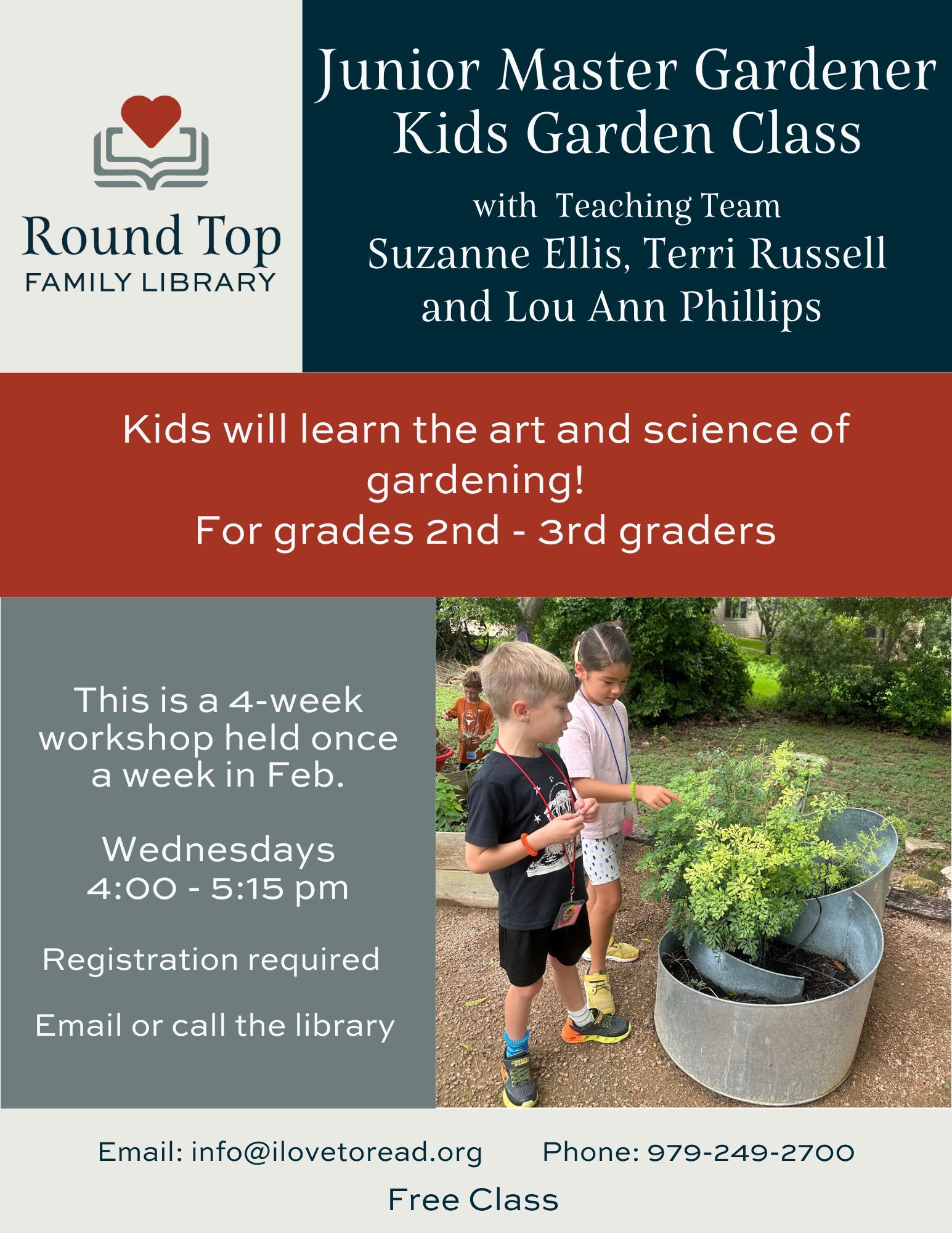 February 11, 2026 @ 4:00 pm - 5:15 pm Junior Master Gardener Kids Garden Class (Round Top) Round Top Family Library 206 W. Mill, Round Top, TX, United States Free