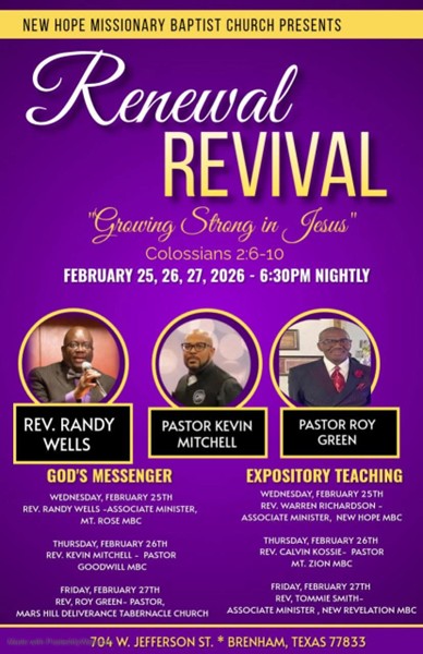 Renewal Revival Services at New Hope MB Church (Brenham) February 25 - February 27 New Hope Missionary Baptist Church (Brenham) 704 W. Jefferson St., Brenham, TX, United States