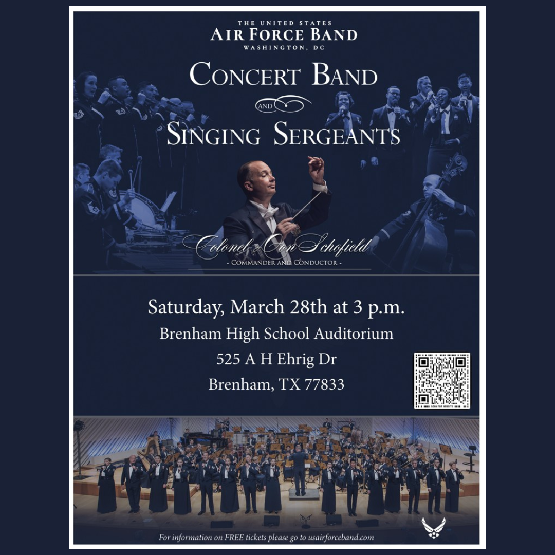 Brenham HS to host the U.S. Air Force Band & Singing Sergeants March 28 @ 8:00 am - 5:00 pm Brenham High School Auditorium 525 A H Ehrig Drive, Brenham, TX, United States