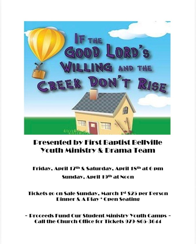 First Baptist Church (Bellville) 504 E Strauss St., Bellville, TX, United StatesPRODUCTION: IF THE GOOD LORD'S WILLING AND THE CREEK DON'T RISE