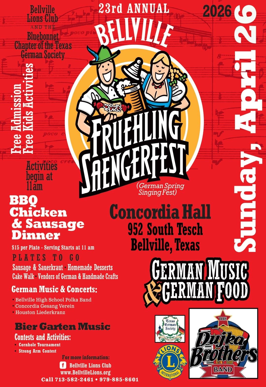 Bellville Fruehling Saengerfest April 26 Concordia Hall 952 South Tesch St., Bellville, TX, United States GERMAN SPRING SINGING FEST