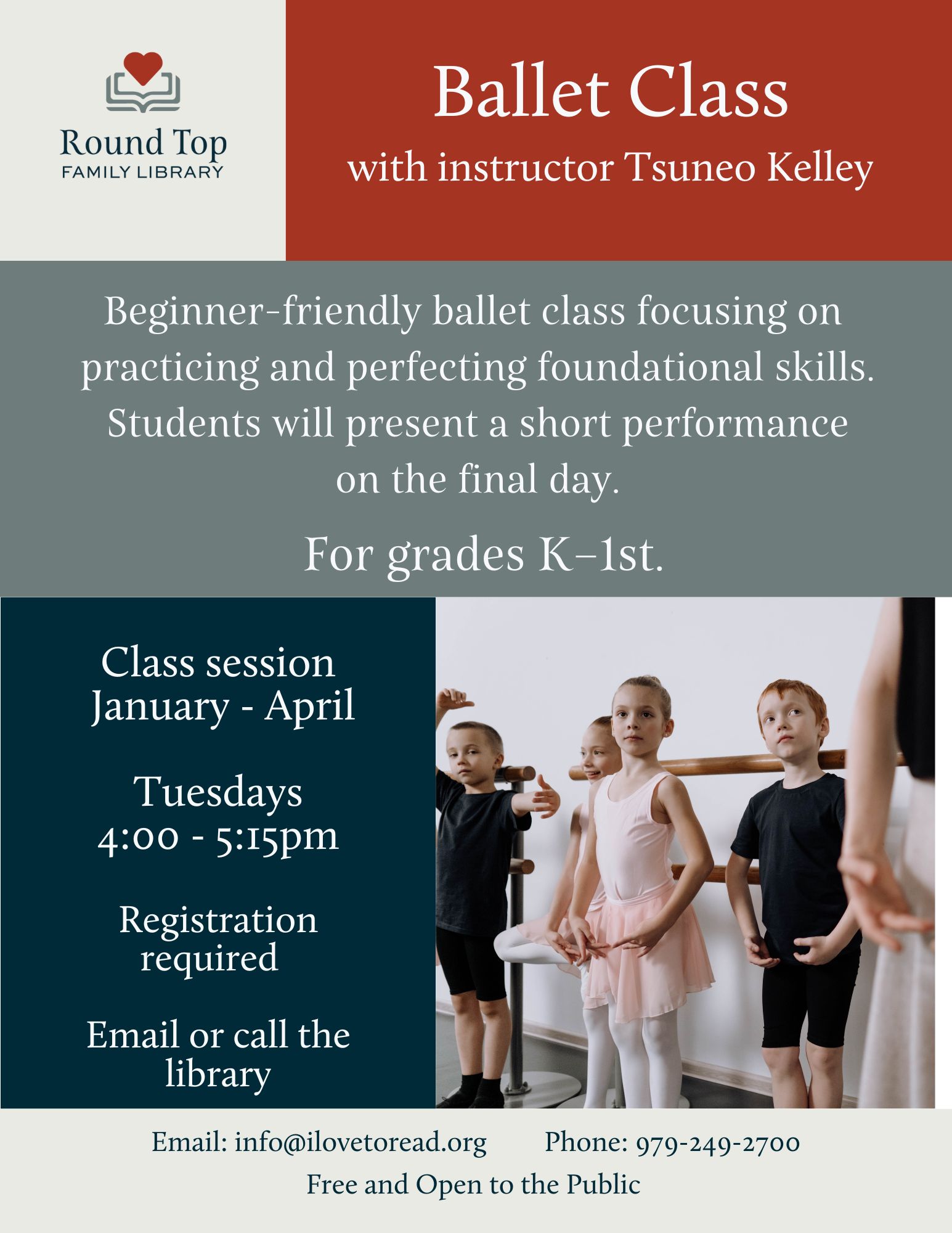 January 6, 2026 @ 4:00 pm - 5:15 pm Ballet Class (Round Top) Round Top Family Library 206 W. Mill, Round Top, TX, United States Free