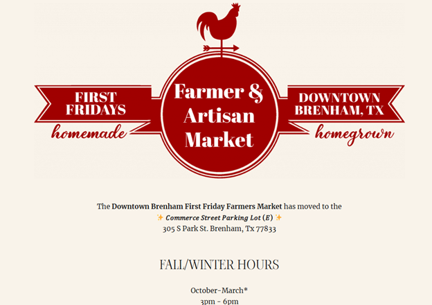 First Fridays Farmers & Artisan Market is an open-air market with local artisan/craft, cottage food, farm-to-market, small business, and retail vendors. Live musical performances located in Historic Downtown Brenham. Unique shopping experience for everyone, offering a mix of vendors that complement one another and the surrounding Downtown businesses.
