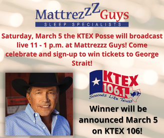 KTEX 106 is teaming up with Mattrezzz Guys in Brenham to send you to see George Strait at the Houston Livestock Show and Rodeo Sunday, March 20th! Sign-up now until March 2 at Mattrezzz Guys in Brenham! Do it soon! The first drawing is March 2!